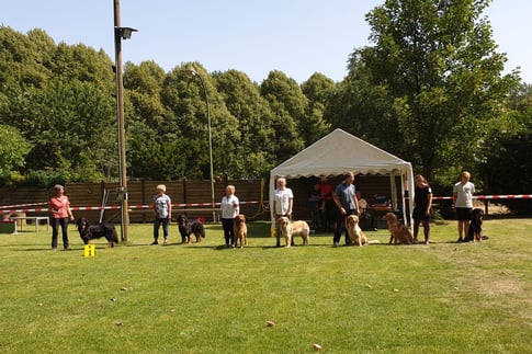 Von links: Baki (V4 Offene Klasse), "Baloe" Baron Rocco van het Boschzicht (V3 Offene Klasse), Mailo vom Hervester Hof (V2 Offene Klasse), Malou vom Hervester Hof (sg Offene Klasse), "Käthe" Cate vom Ostenholz (V1 Jugendklasse, Bester Junghund, Deutscher Jugend-Champion Club-HZD), Calina vom Ostenholz (V3 Jugendklasse), "Vito" Collin vom Hof Mönkenbrook (sg4 Jugendklasse).